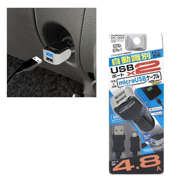 カシムラ DC-4.8A-USB 2ポート 自動識別 microUSBケーブル [DC-009]