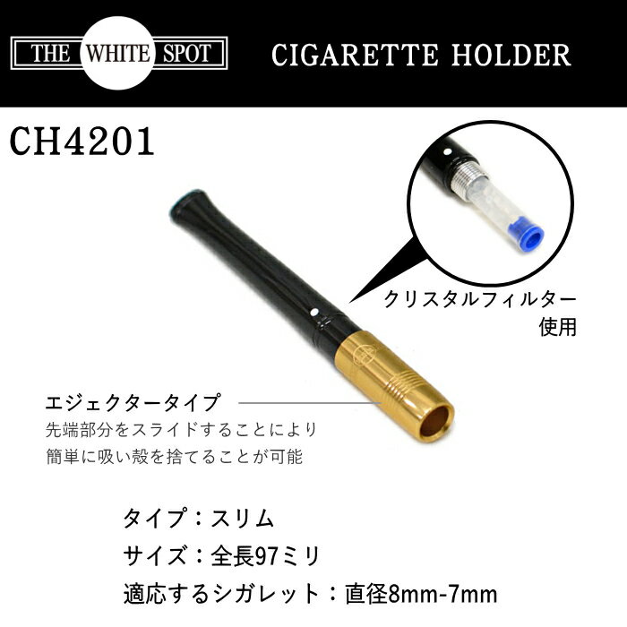 商品詳細用途シガレット用ホルダー適応サイズ直径8mmのシガレット (スリムタイプは使用できません)サイズH97×φ11mm重さ9gフィルタークリスタルフィルター付属品スペアフィルター×10本、取扱説明書、外箱入り製造国イギリス製【ダンヒルホルダー】消耗品THE WHITE SPOT dunhill CIGARETTE HOLDERダンヒルシガレットホルダーCH4201 エジェクタースリム ゴールディアム(97mm)